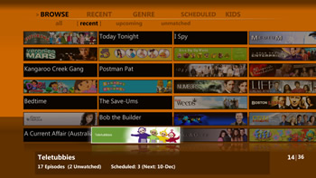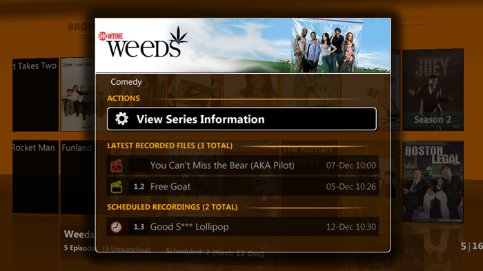 In the example below (for the TV Series ‘Weeds’) – this popup window allows you to view series details, directly play the video clips – or look at recorded files. If the user clicks ‘View Series’ then they will be taken to the Series/Episode view screens (as previewed in my last post).